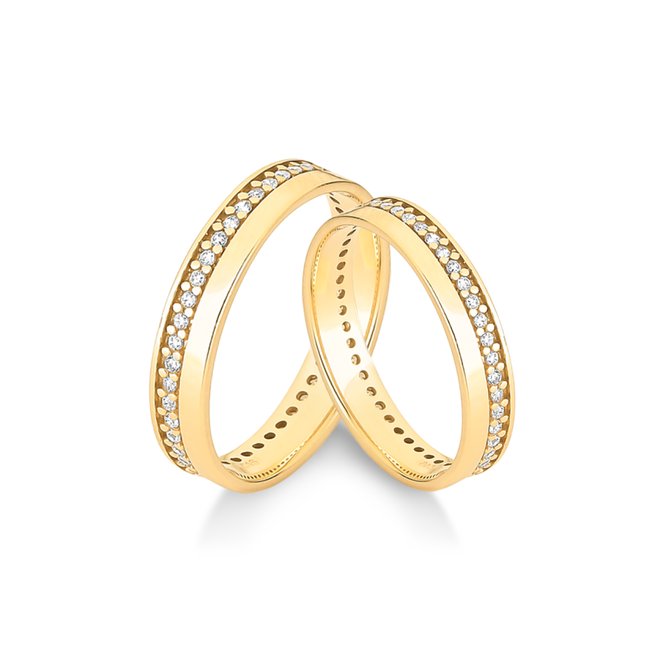 Aliança com friso lateral cravejado com pedras de Zircônias.