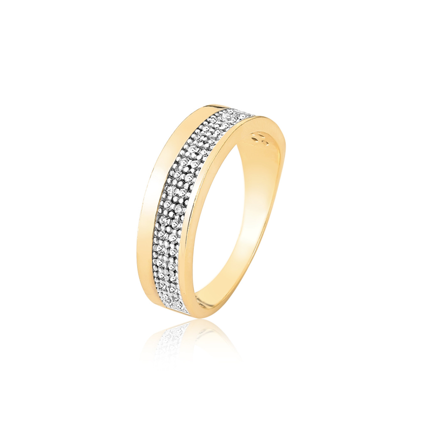 Anel aparador com duas fileiras cravejadas com pedras de zircônia e detalhe liso na borda.