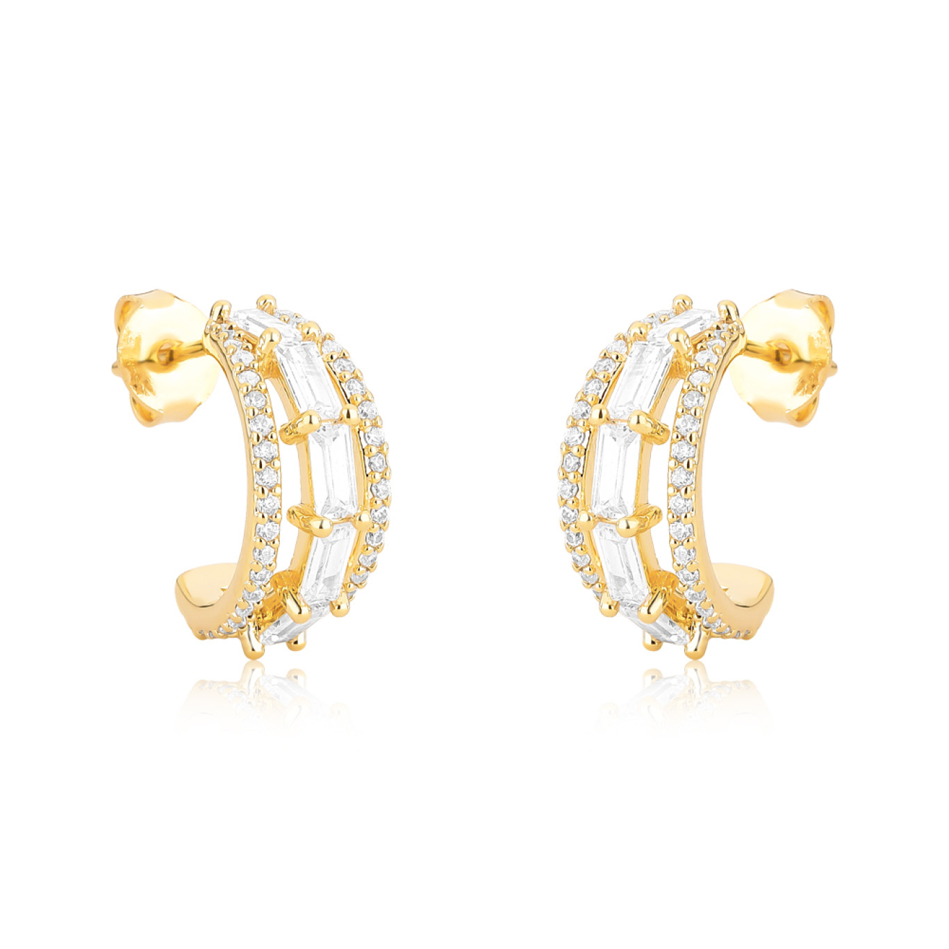 Modelo dois fios cravejados em zircônia com fio zircônia baguete central, com tarraxa.