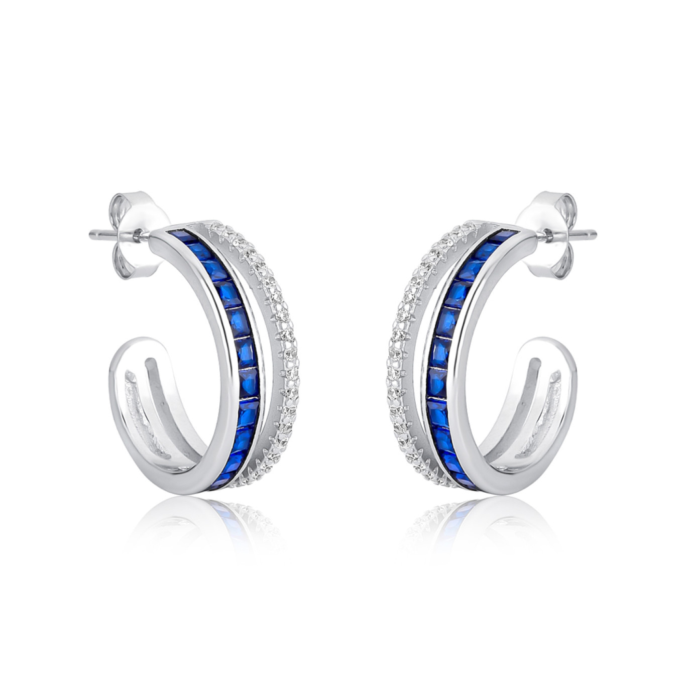 Modelo aberto com tarraxa, duas fileiras cravejadas com zircônias, um fileiras com pedras quadradas azuis e outra com pedras de cristal.
