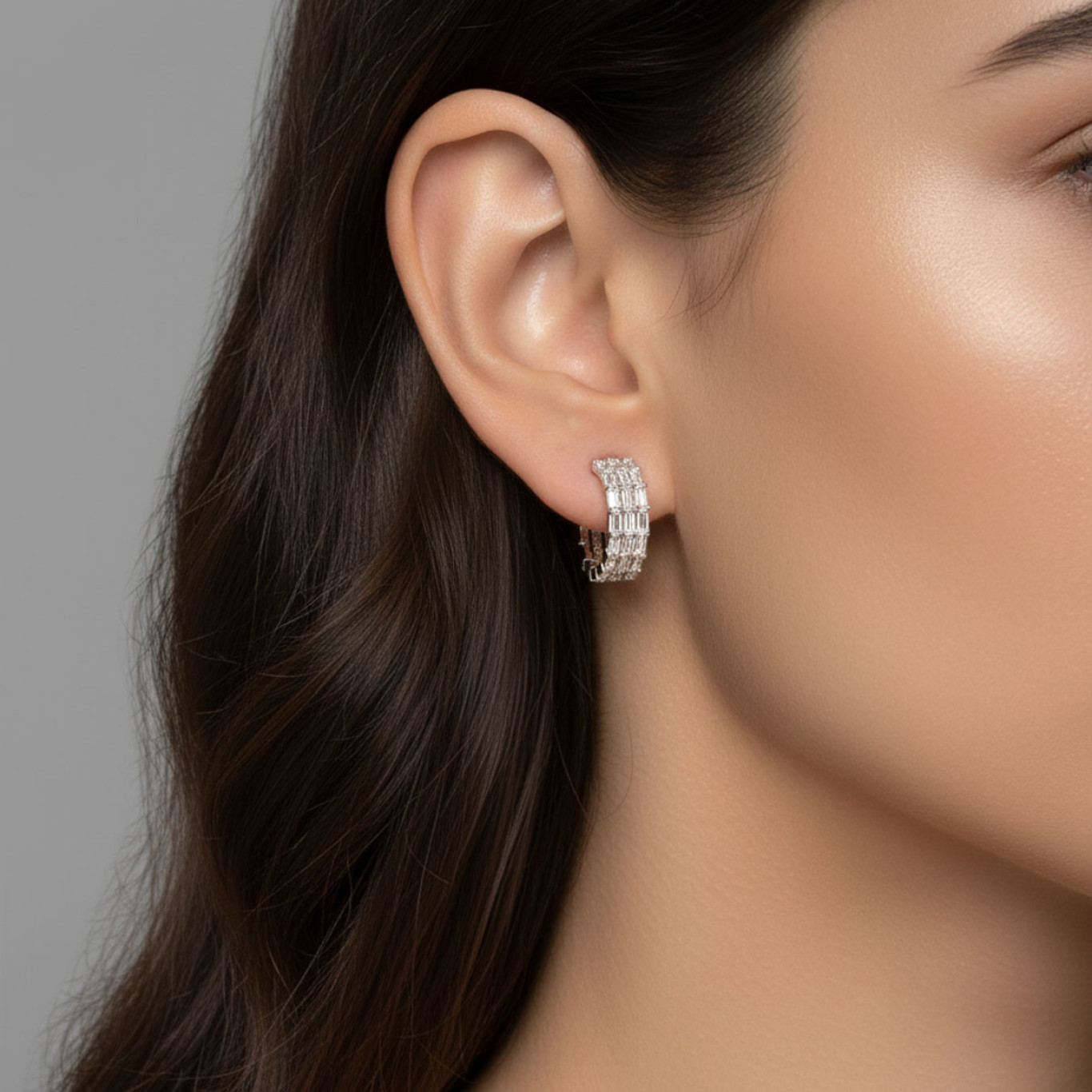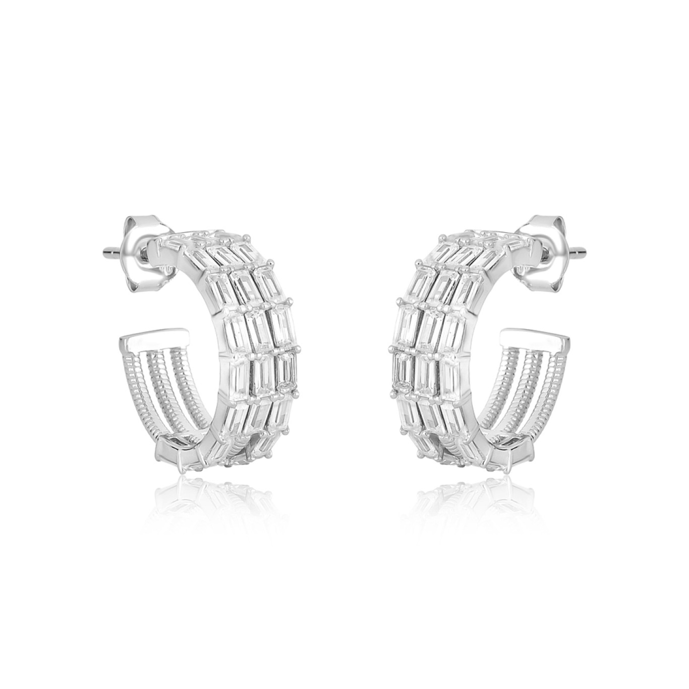 Modelo aberto com tarraxa, cravejada com zircônias baguetes.