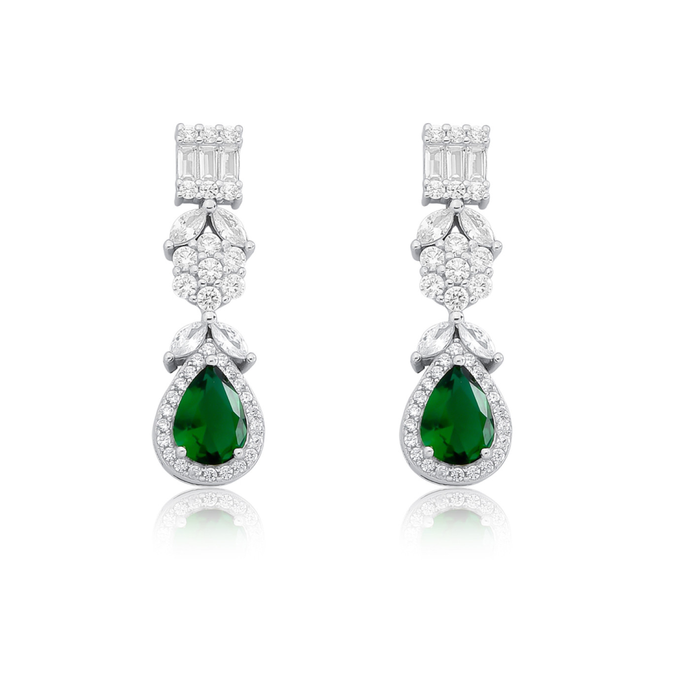Modelo cravejado com base quadrada e flor, e gota de zircônia esmeralda.