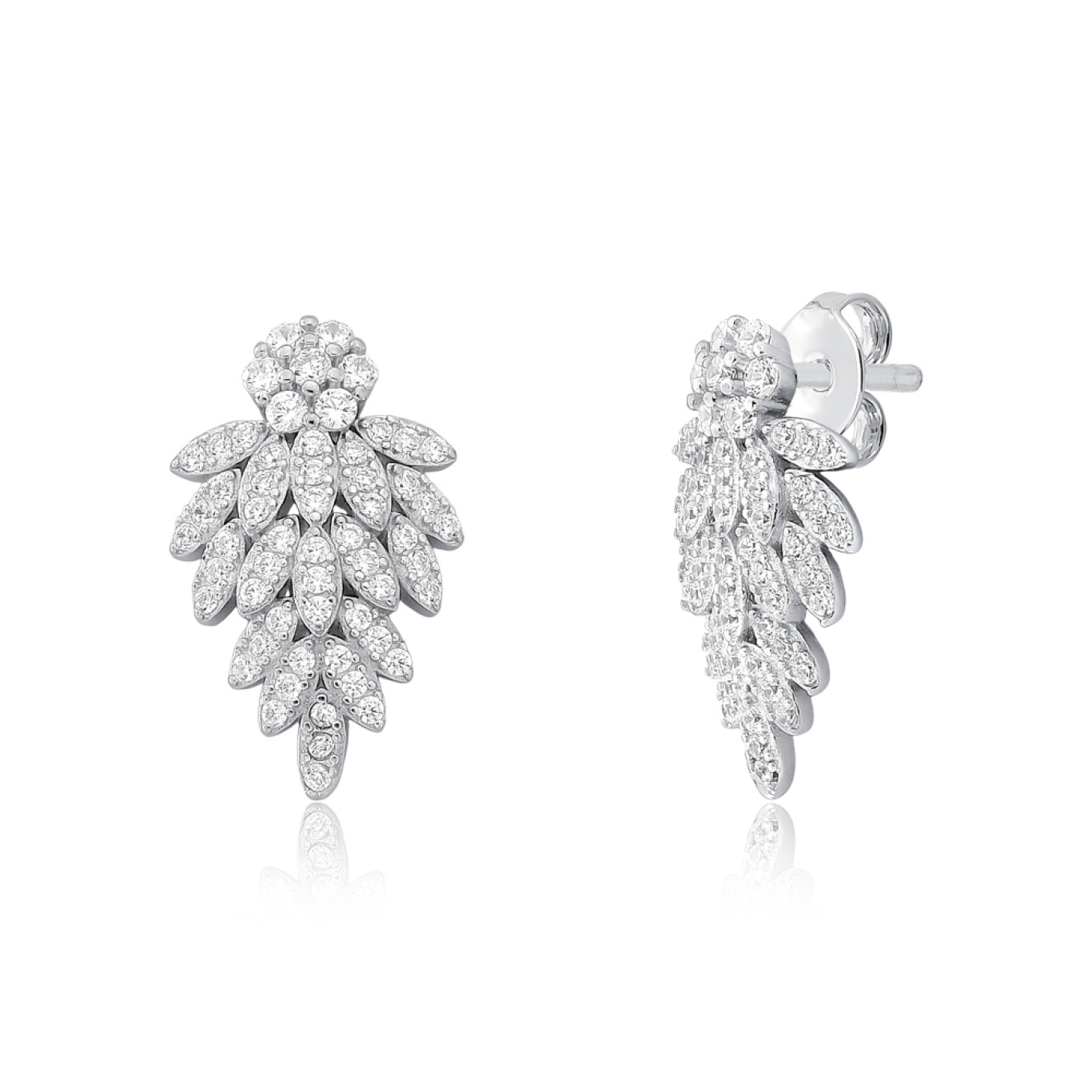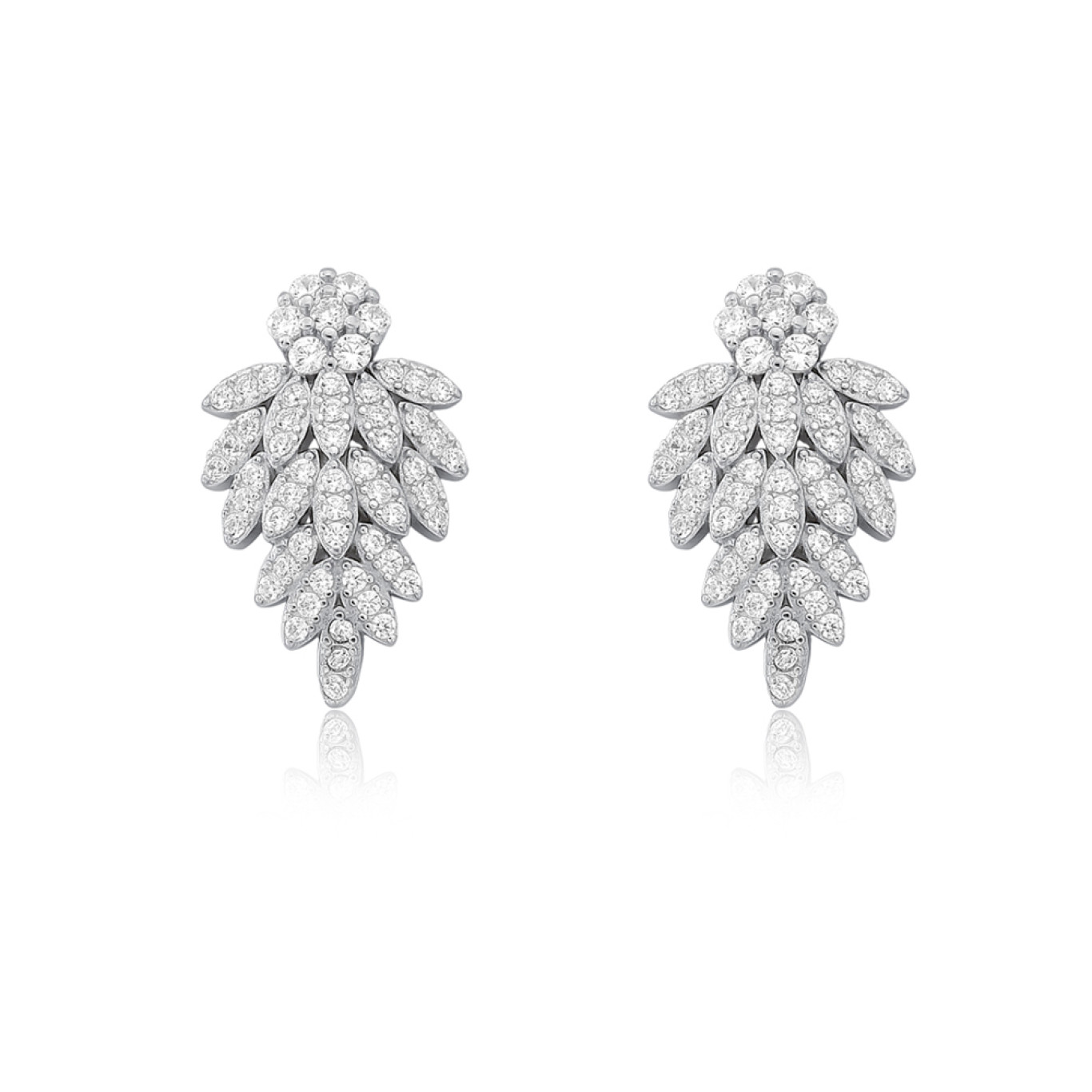 Brinco de pino com uma flore e ramo de folhas cravejado com zircônias.