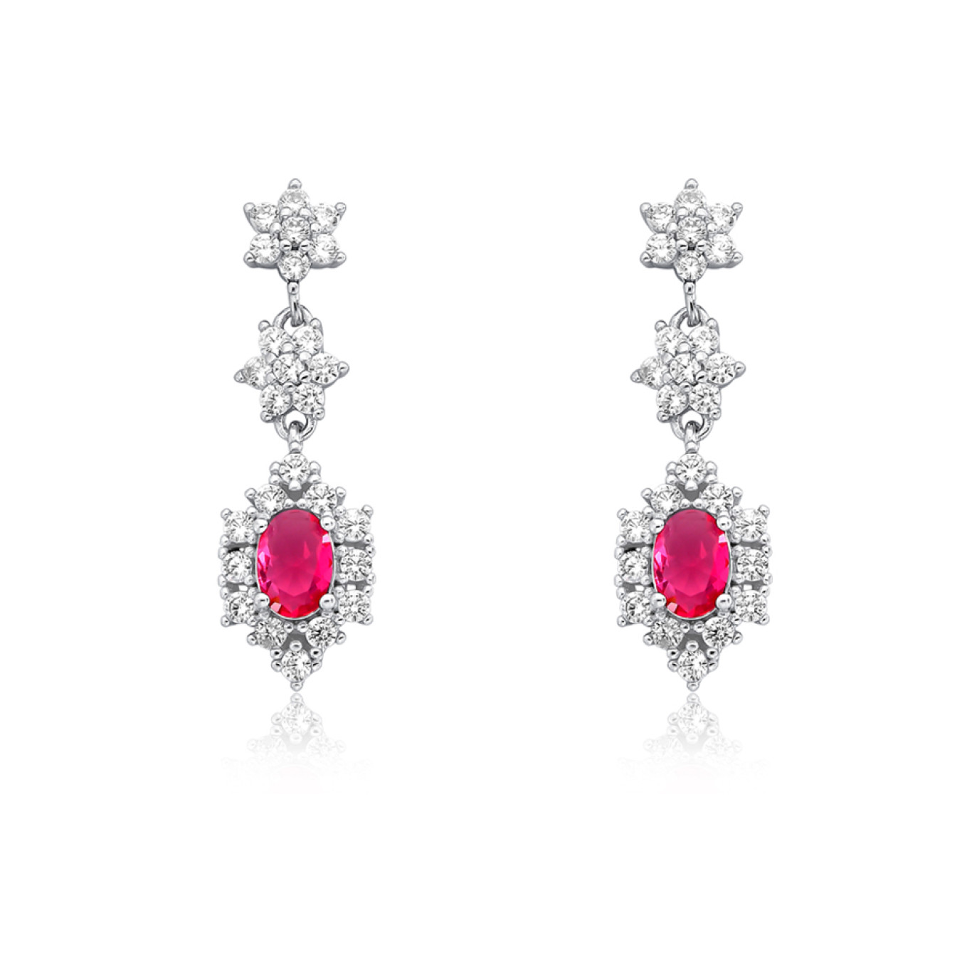 Brinco de pino com duas flores suspensas e zircônia oval Rubi central e borda cravejada.