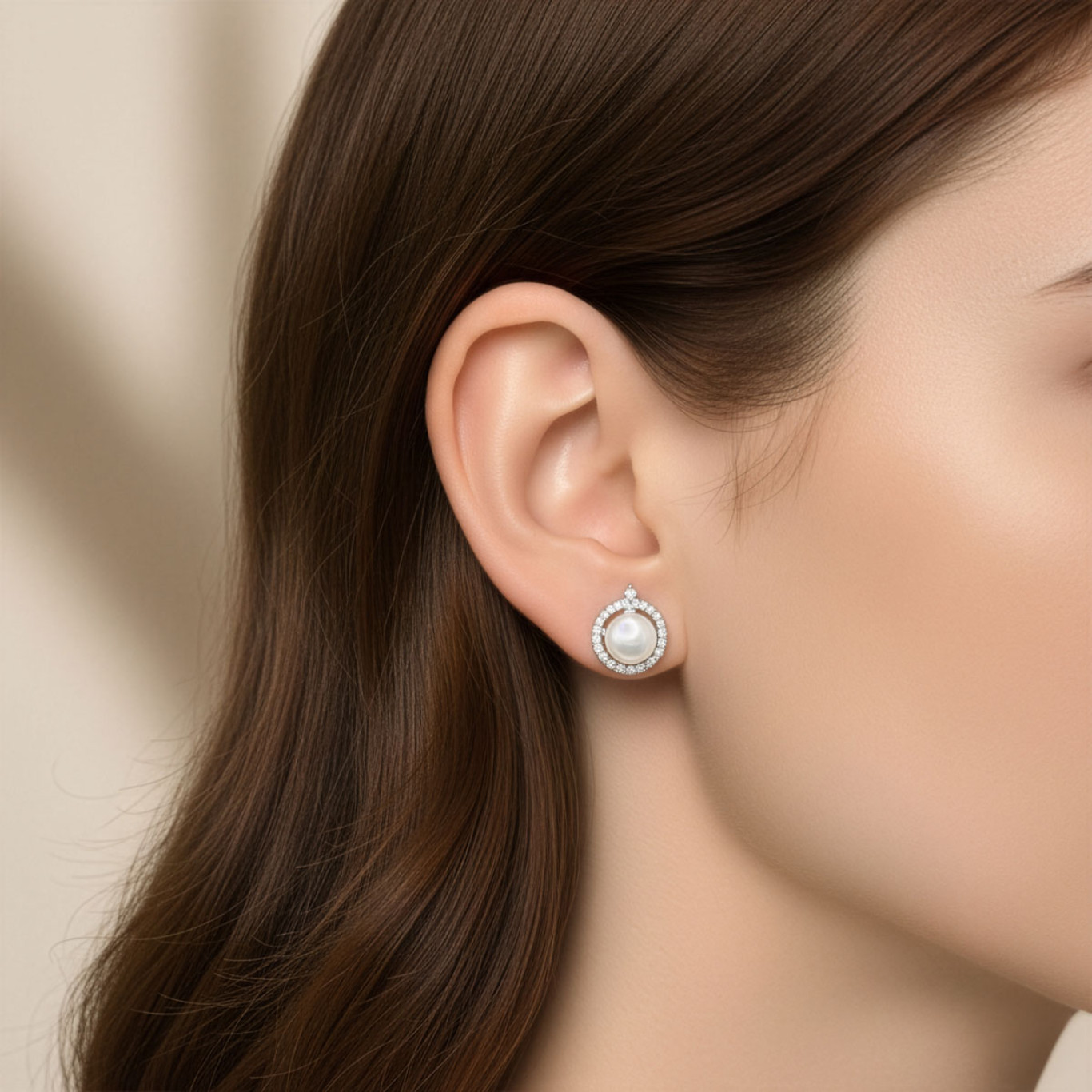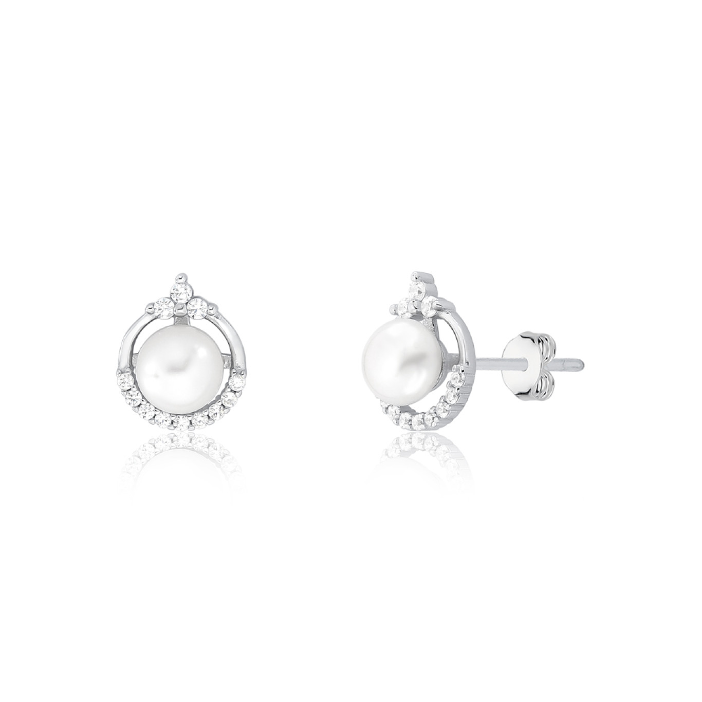 Modelo fixo com base vazada cravejada e pérola natural no centro.