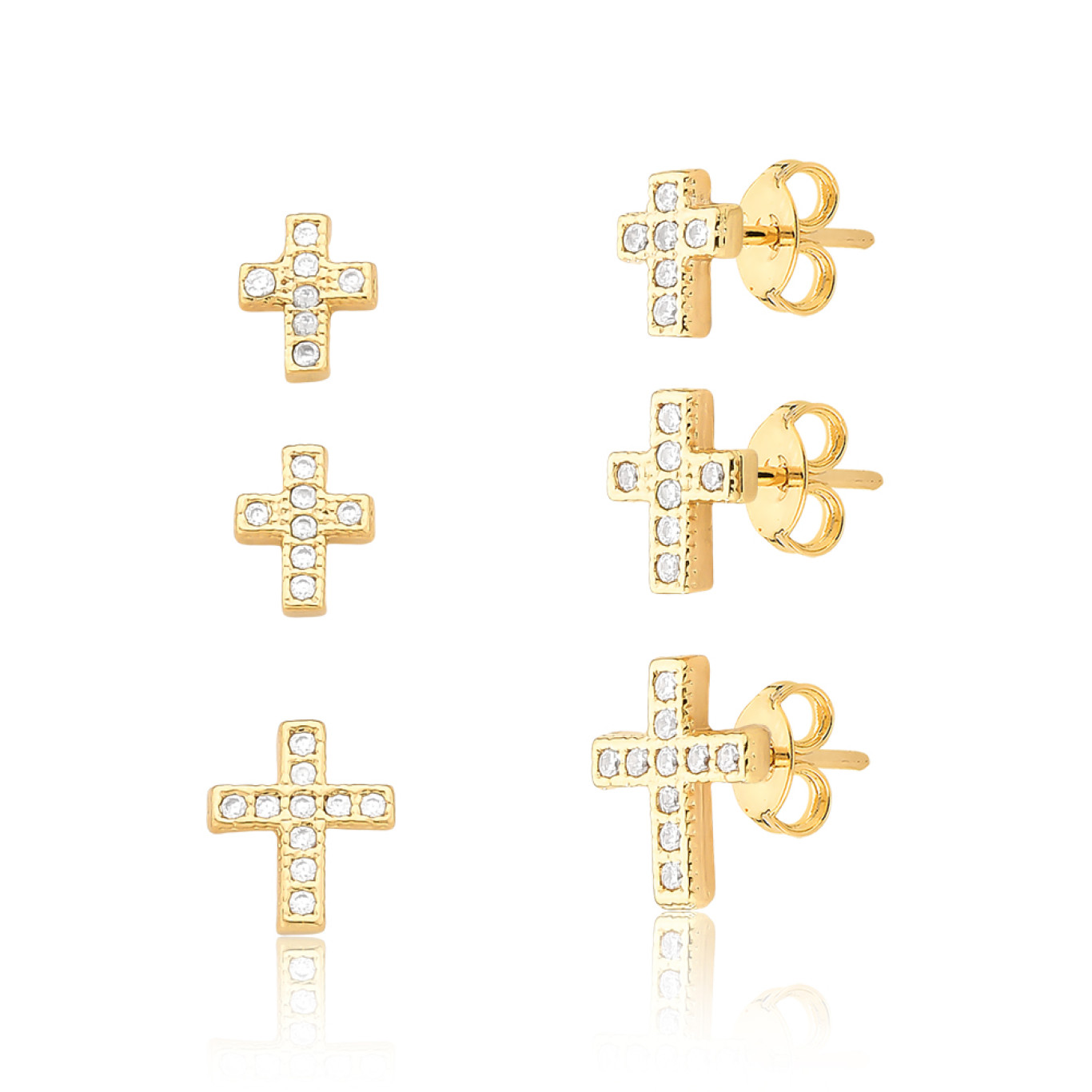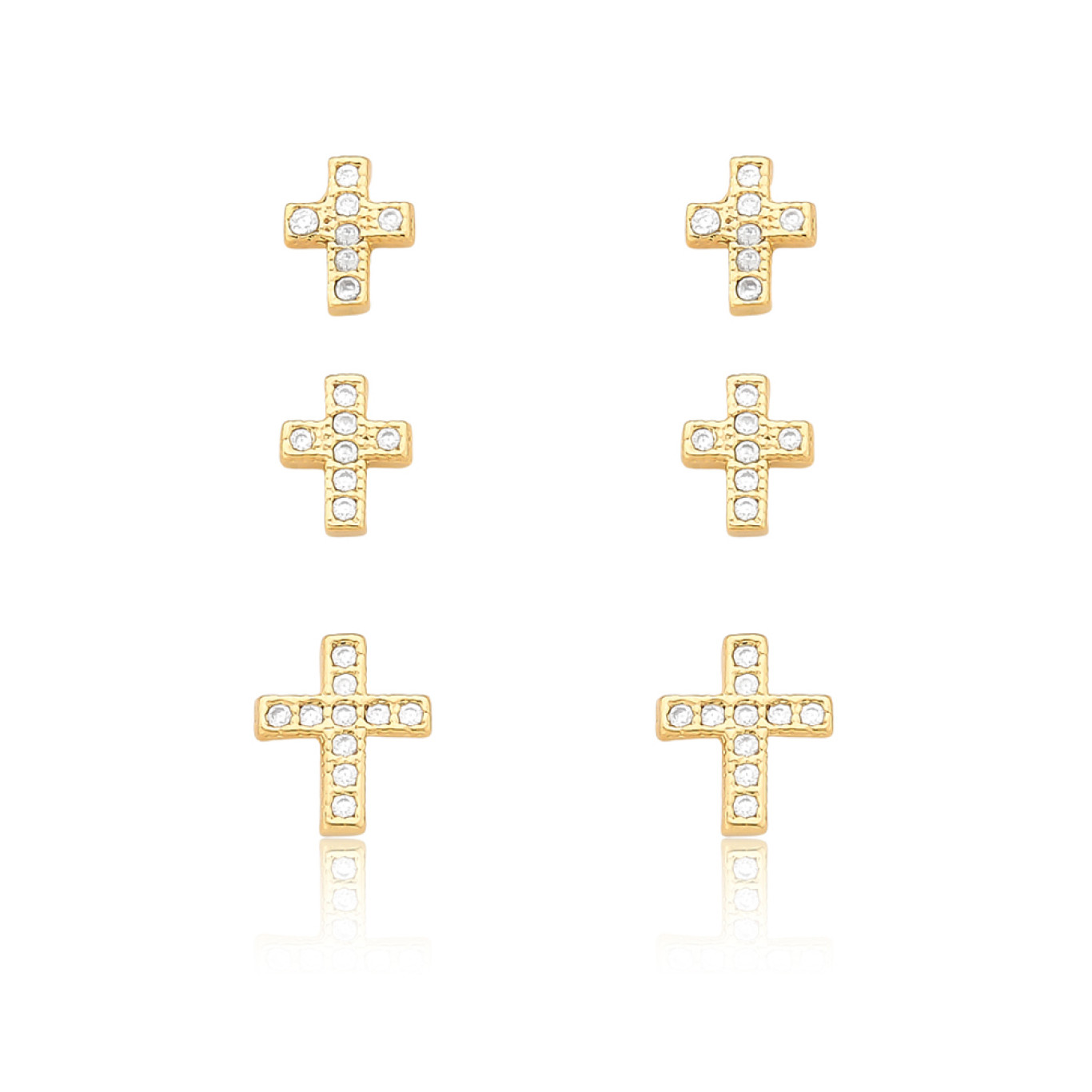 Kit composto por 3 brincos de pino formato cruz cravejada com zircônias.