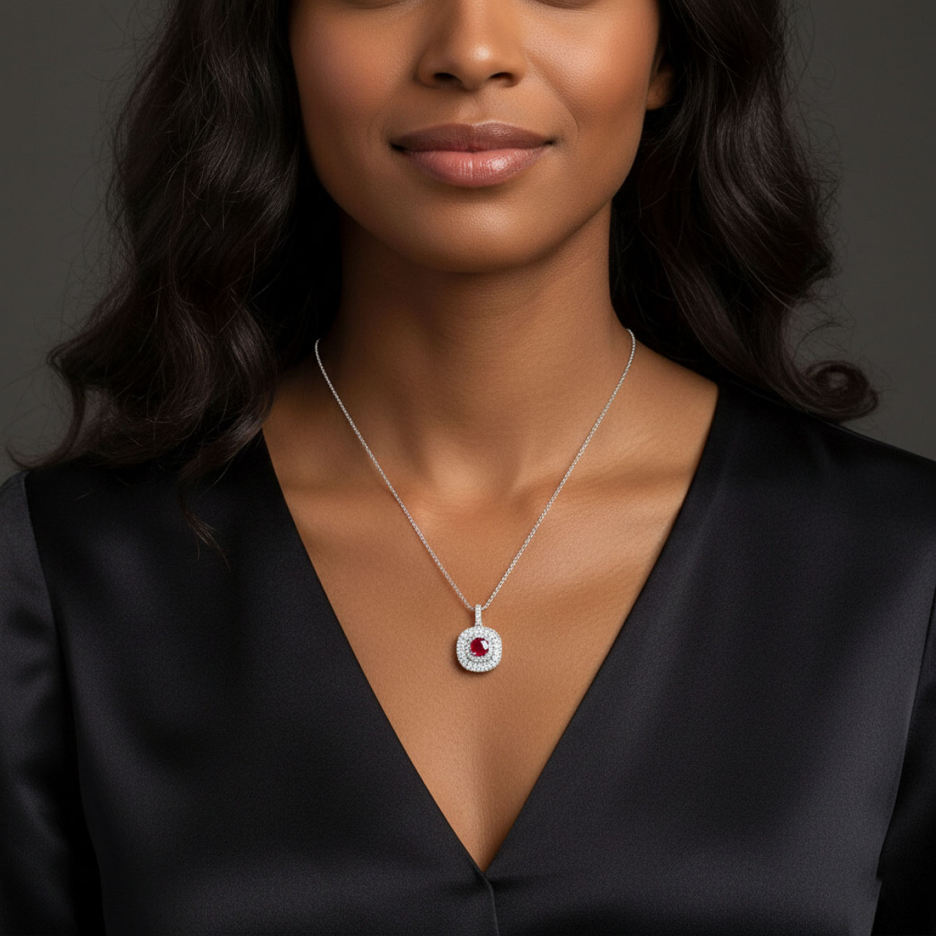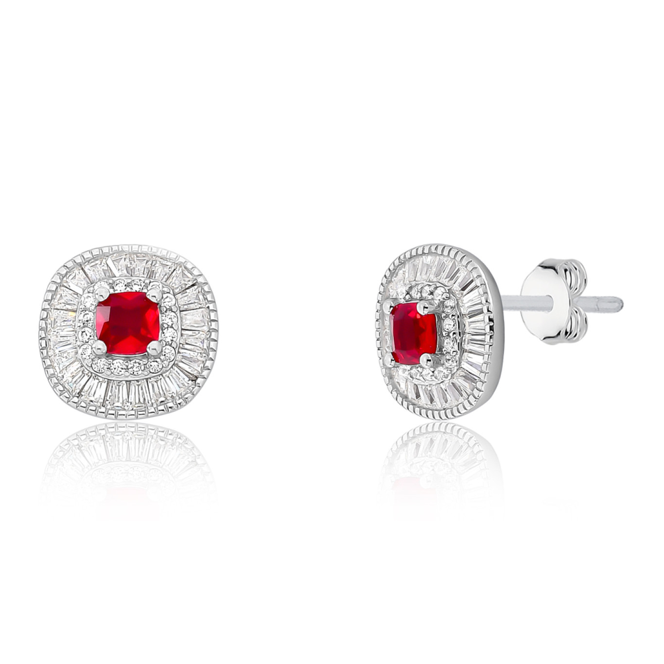Brincos fixos de pino no formato quadrado com zircônia na cor rubi no centro e borda cravejada.