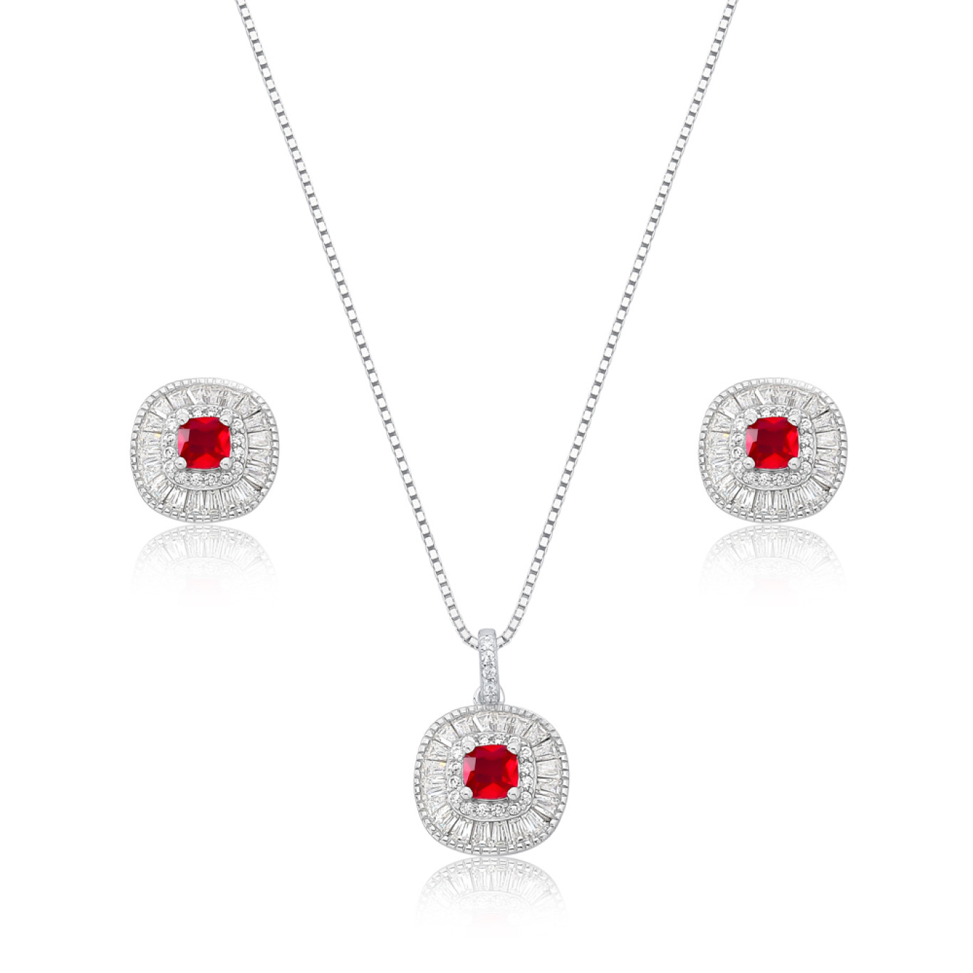 Conjunto sofisticado confeccionado em Prata Legítima 925 com acabamento em Ródio, que garante maior proteção contra oxidação, arranhões e proporciona brilho intenso.