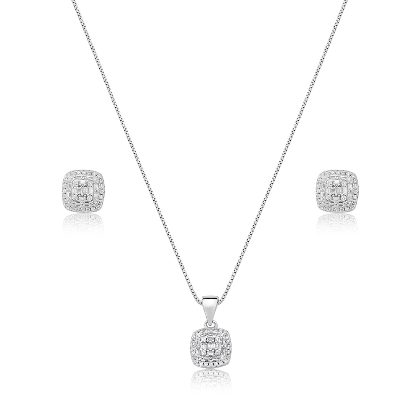 Conjunto sofisticado confeccionado em Prata Legítima 925 com acabamento em Ródio, que garante maior proteção contra oxidação, arranhões e proporciona brilho intenso.