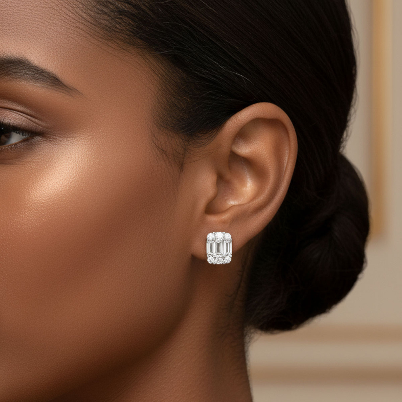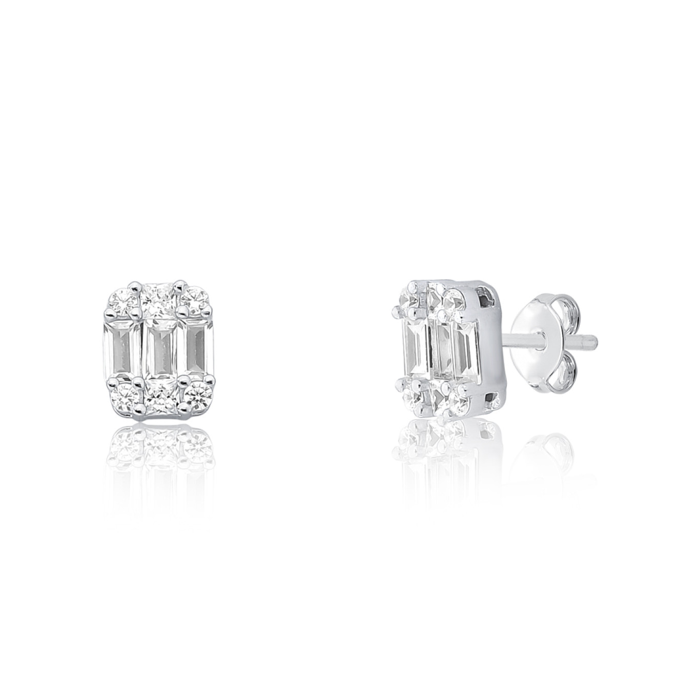 Brincos fixos de pino no formato retangular com zircônias baguete no centro e borda cravejada.