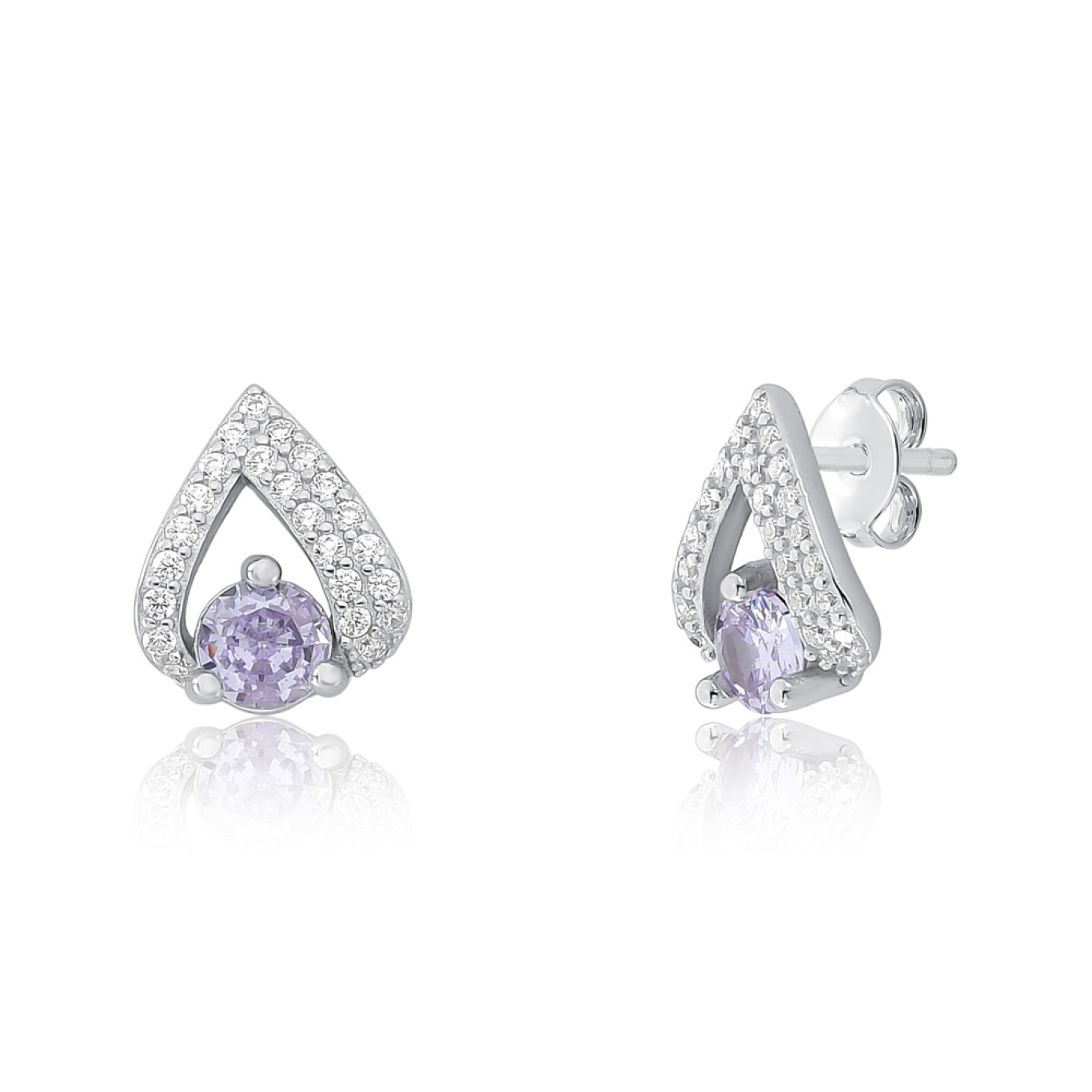 Brincos fixo de pino no formato triangulo com zircônia na cor ametista e borda cravejada com zircônias.