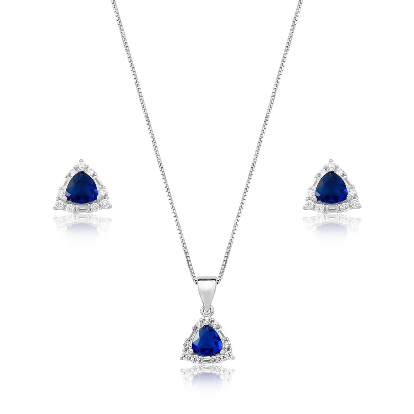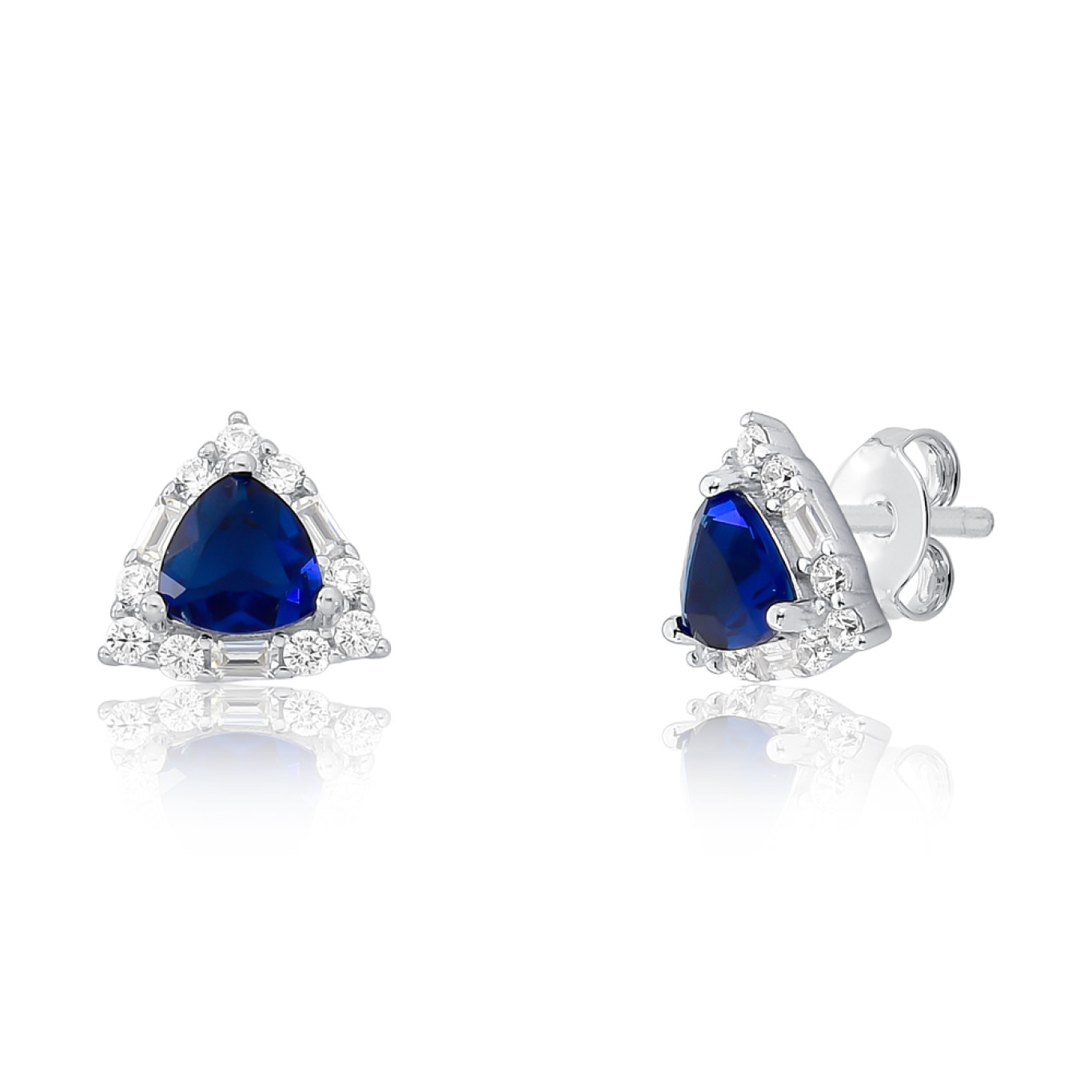 Brincos fixo de pino no formato triangulo com zircônia na cor safira no centro e borda cravejada com zircônias baguetes e redondas.