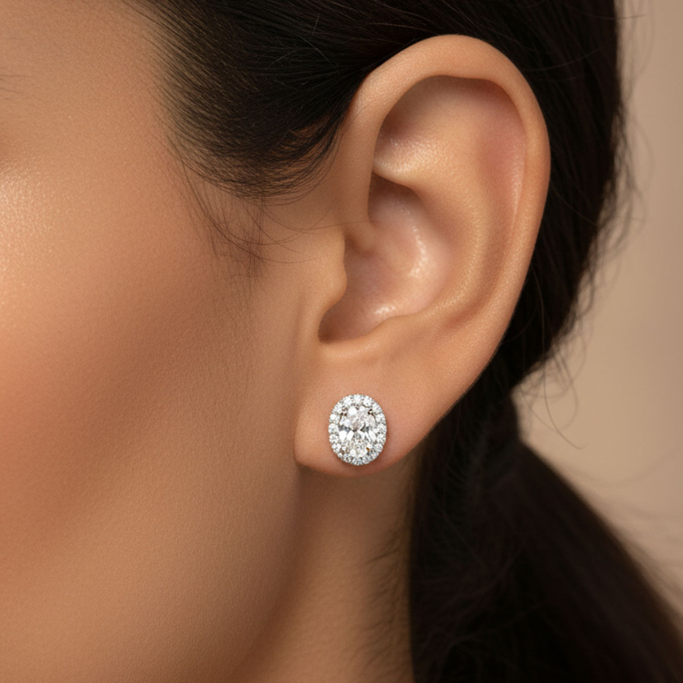 Brincos fixos de pino no formato de oval com zircônia central e borda cravejada.