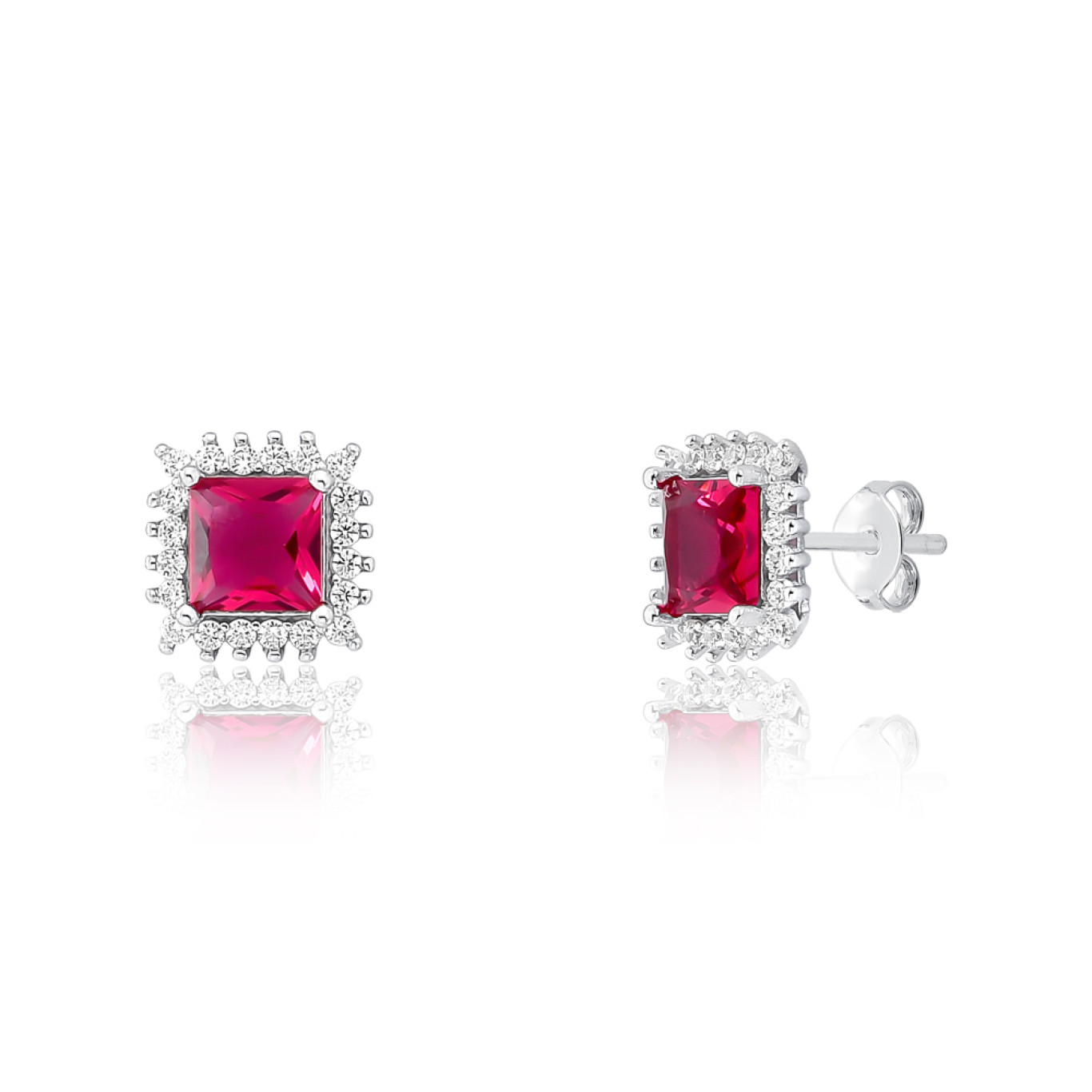 Brincos fixos de pino no formato quadrado com zircônia Rubi central e borda cravejada.