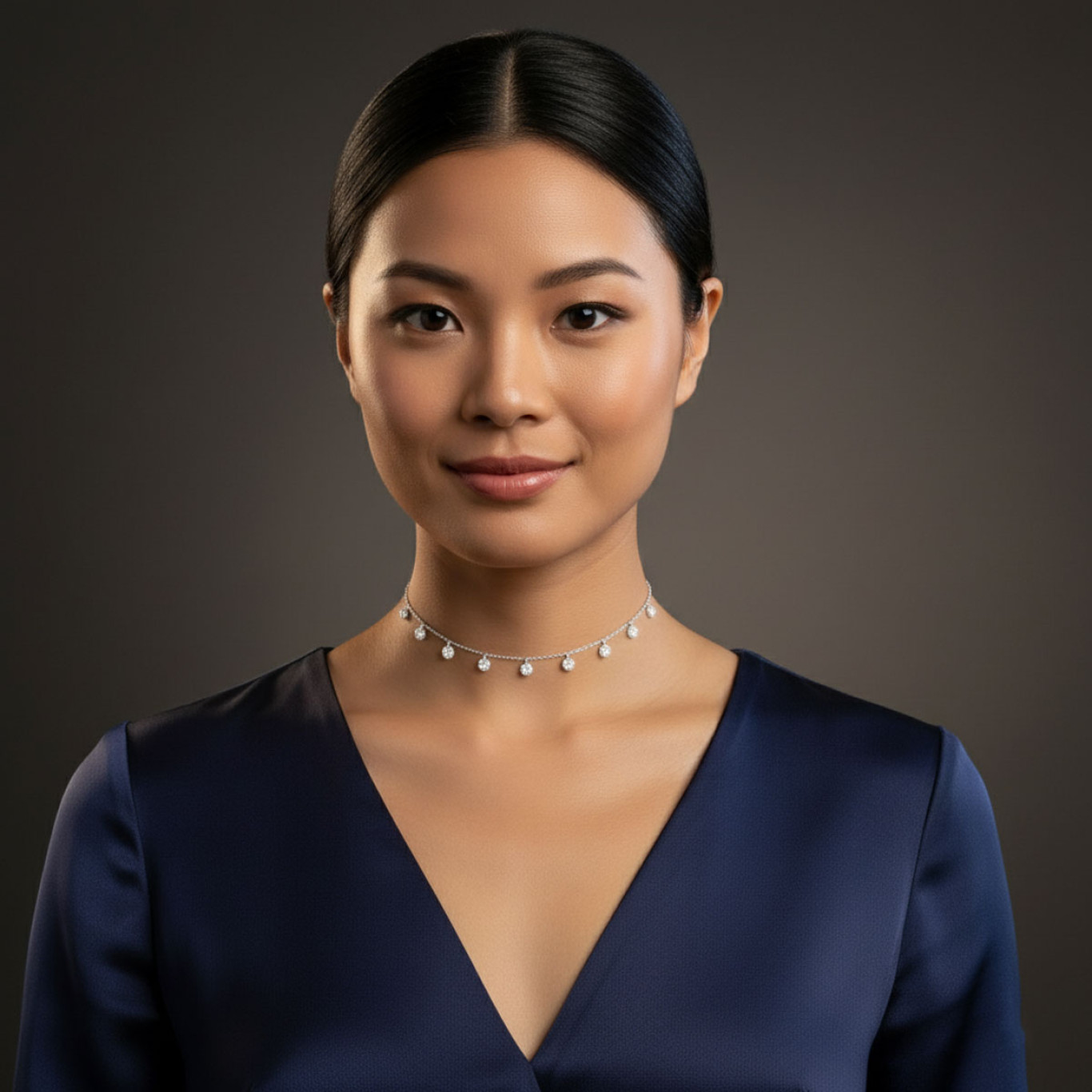 Modelo malha cartiezinha com 14 pingentes suspensos de zircônias pontos luz.