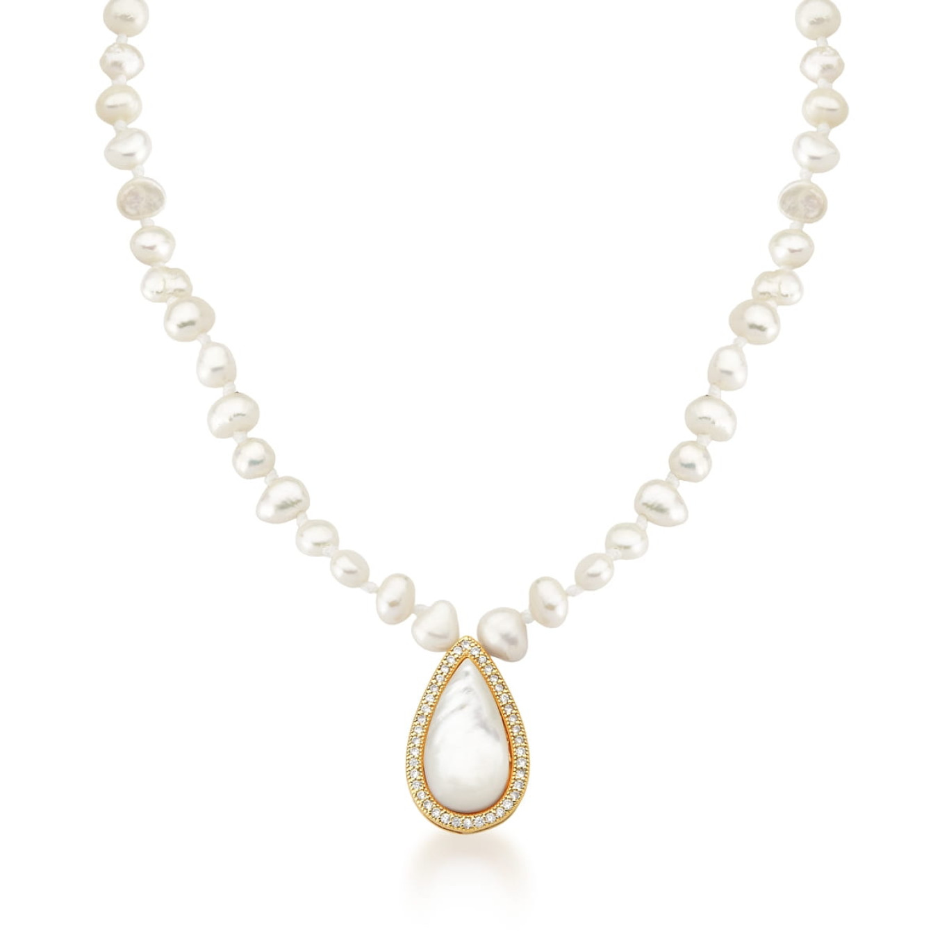 Modelo com pérolas de água doce e pingente de gota madrepérola com borda cravejada com zircônias.