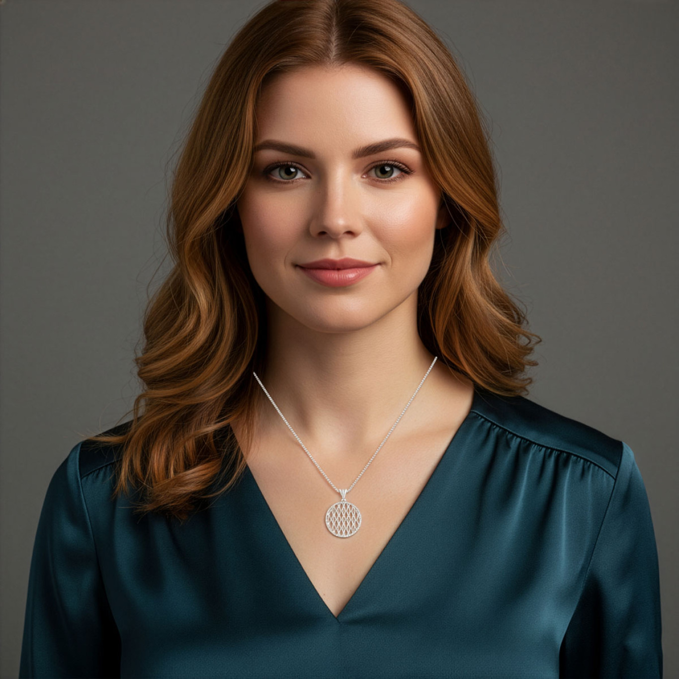 Corrente malha veneziana, com pingente redondo estilo renda vazada.