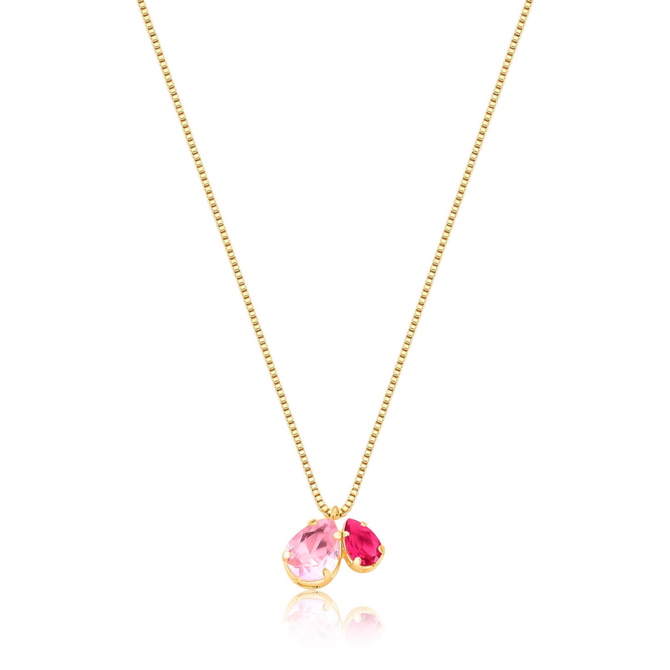 Malha veneziana, pingente com duas zircônias formato gota, sendo uma gota rosa e uma gota menor rubelita.