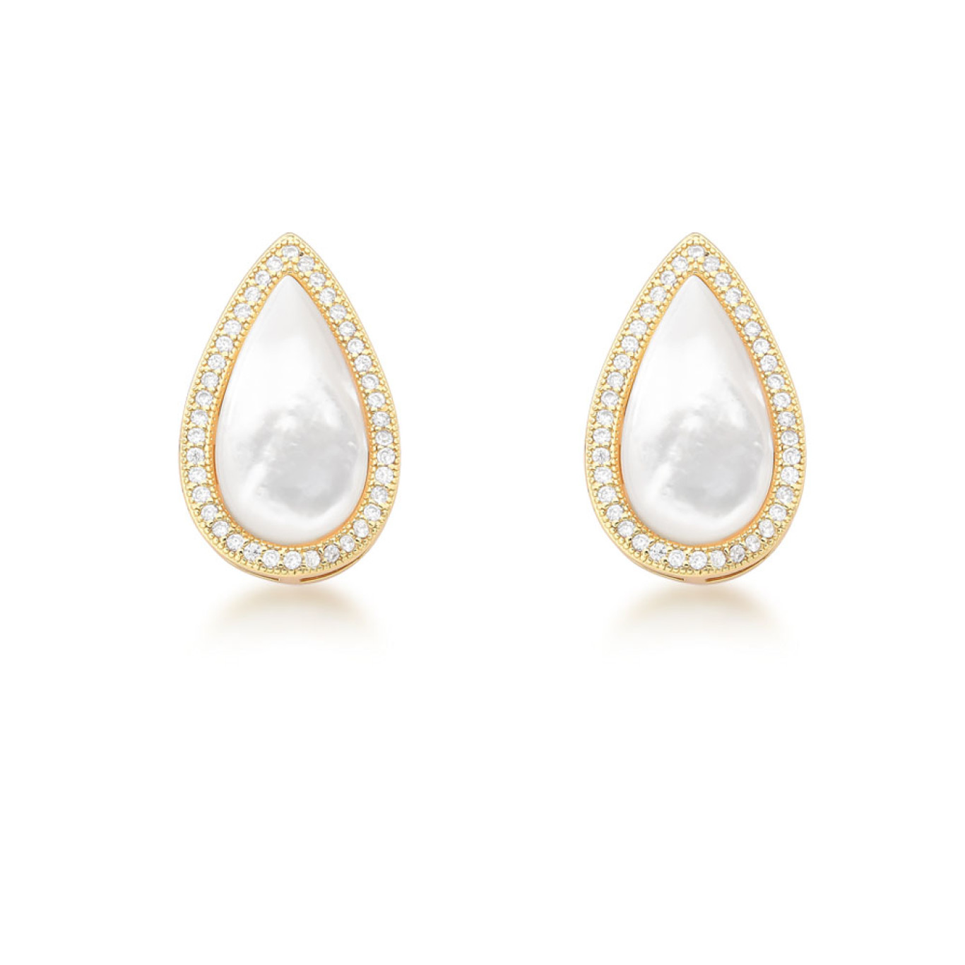 Modelo fixo gota madrepérola com borda cravejada com zircônias.