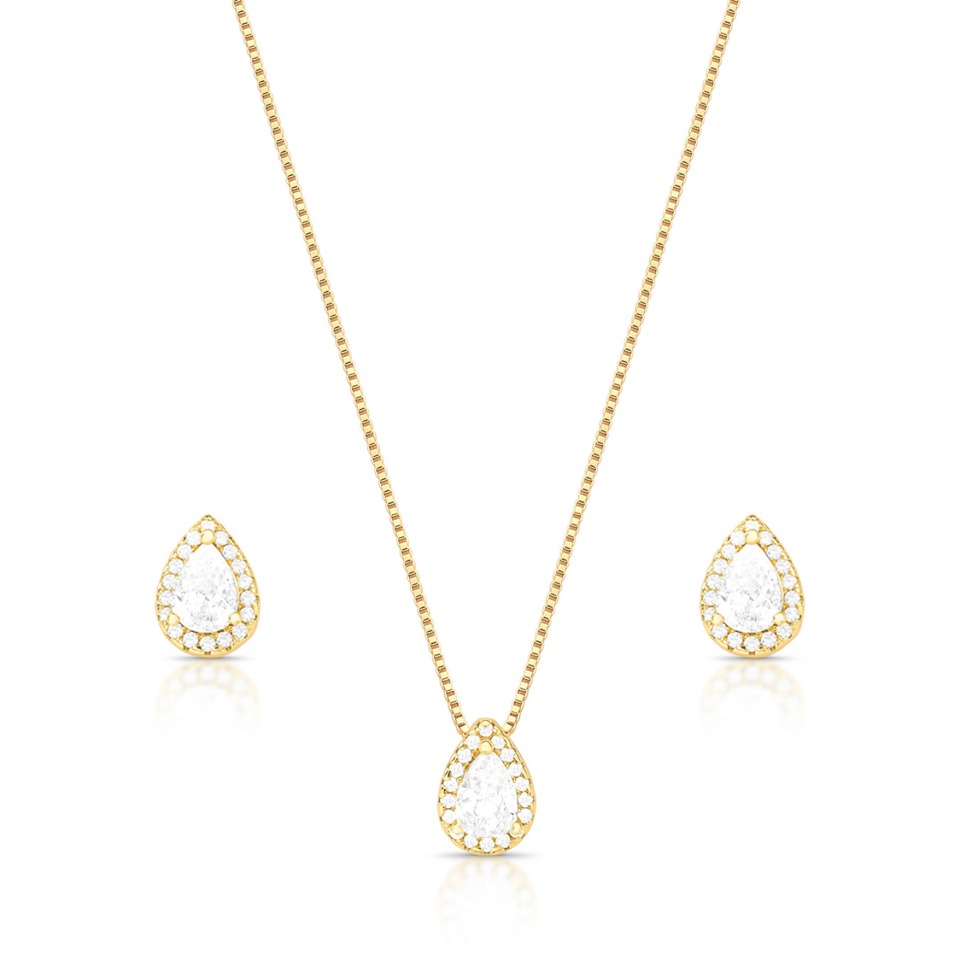 Brincos de pino, formato gota com zircônia, e com borda cravejada.