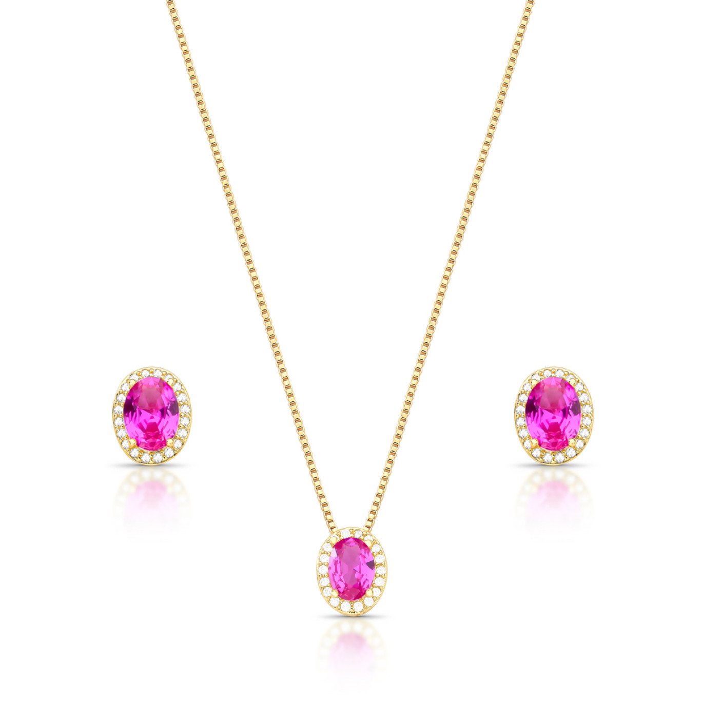 Brincos de pino, formato oval com zircônia na cor rubi, e com borda cravejada.