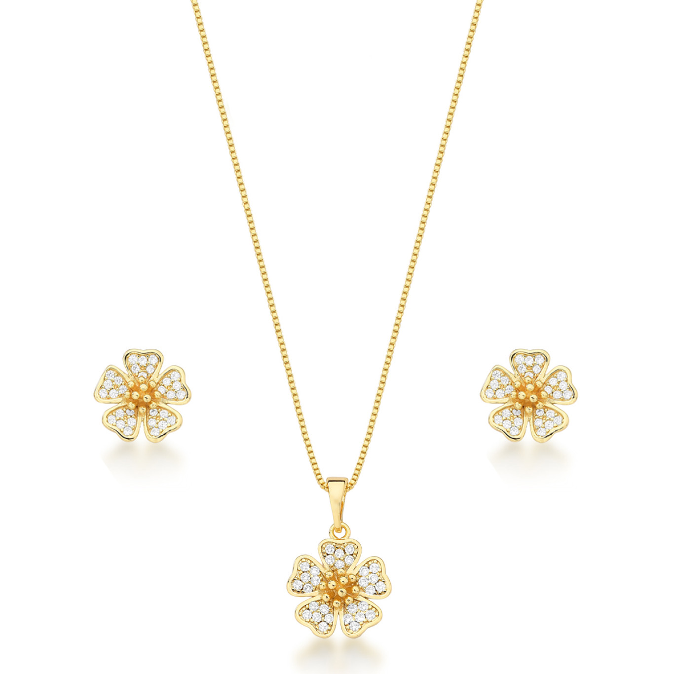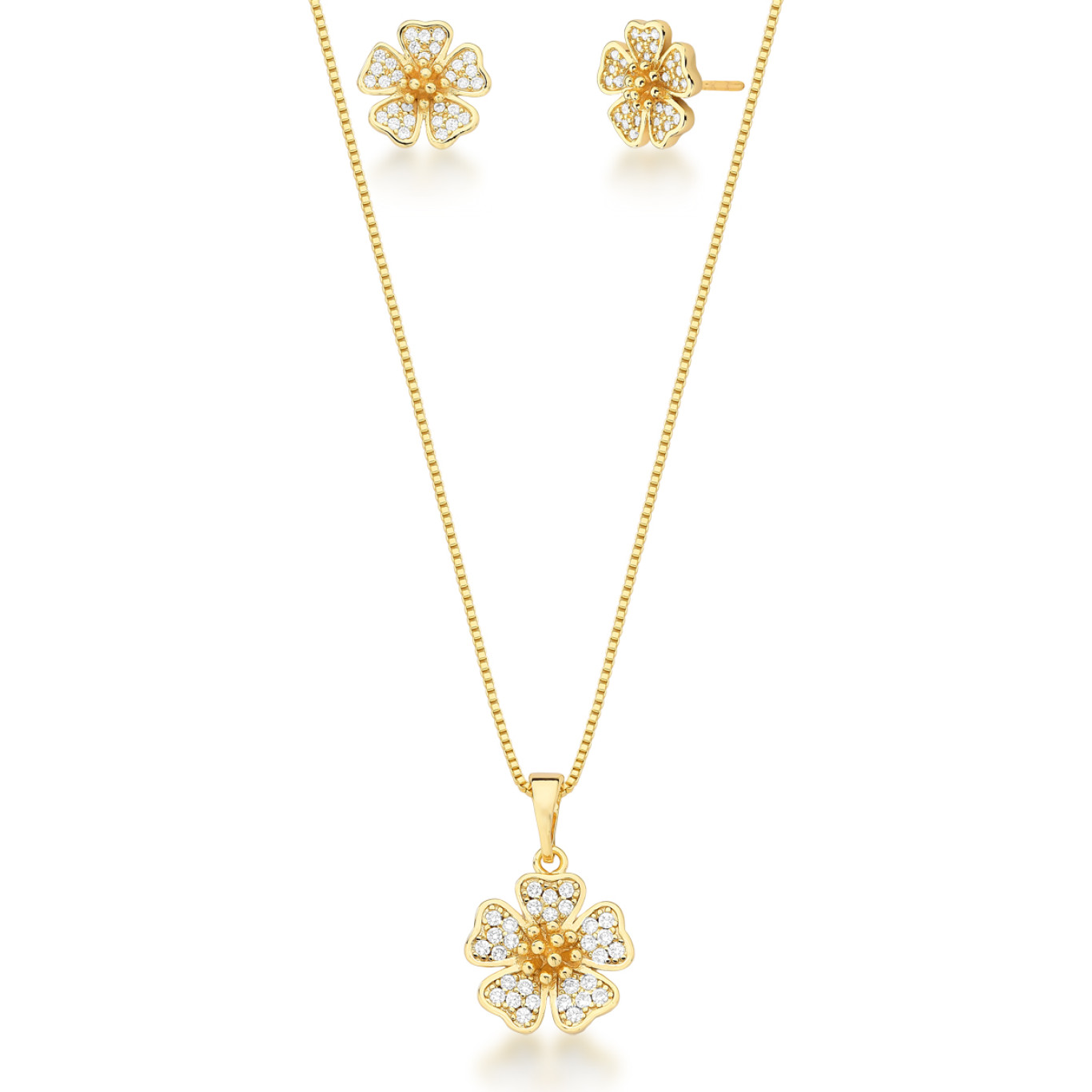 Colar Trevo e Balão Cravejados Intercalados 60cm Folheada a Ouro 18k