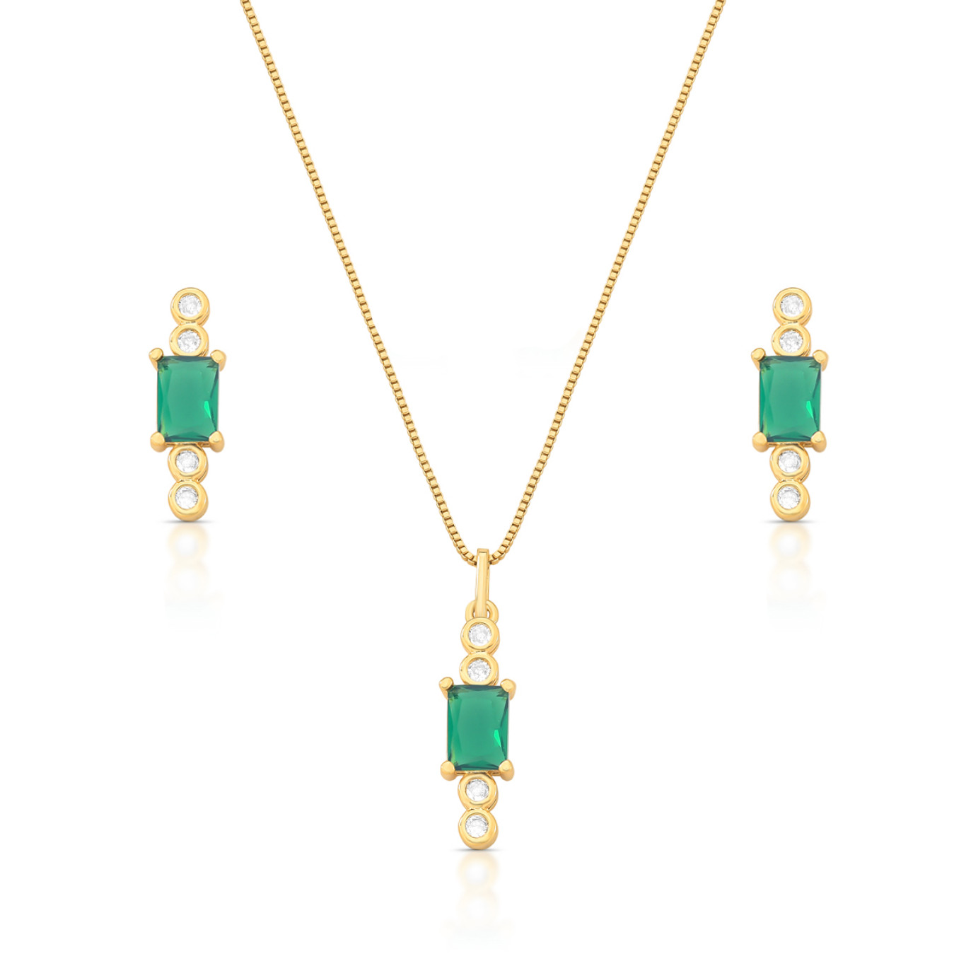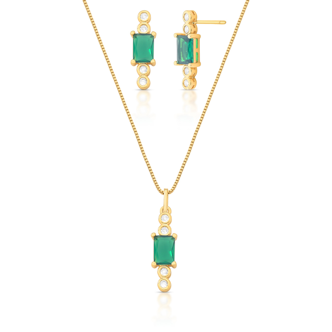 Brincos de pino, zircônia verde esmeralda e pontos luz embutidos.