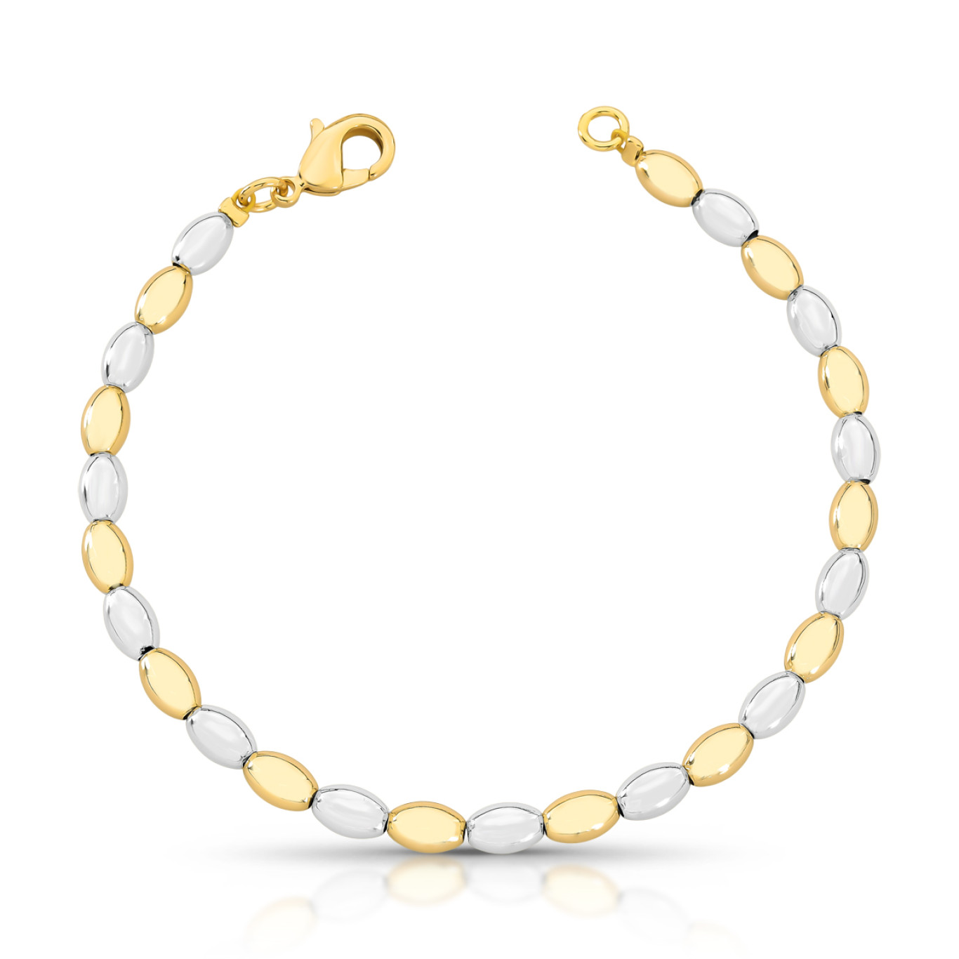 Modelo com vários grãos lisos, dois tons de ouro, branco e amarelo.