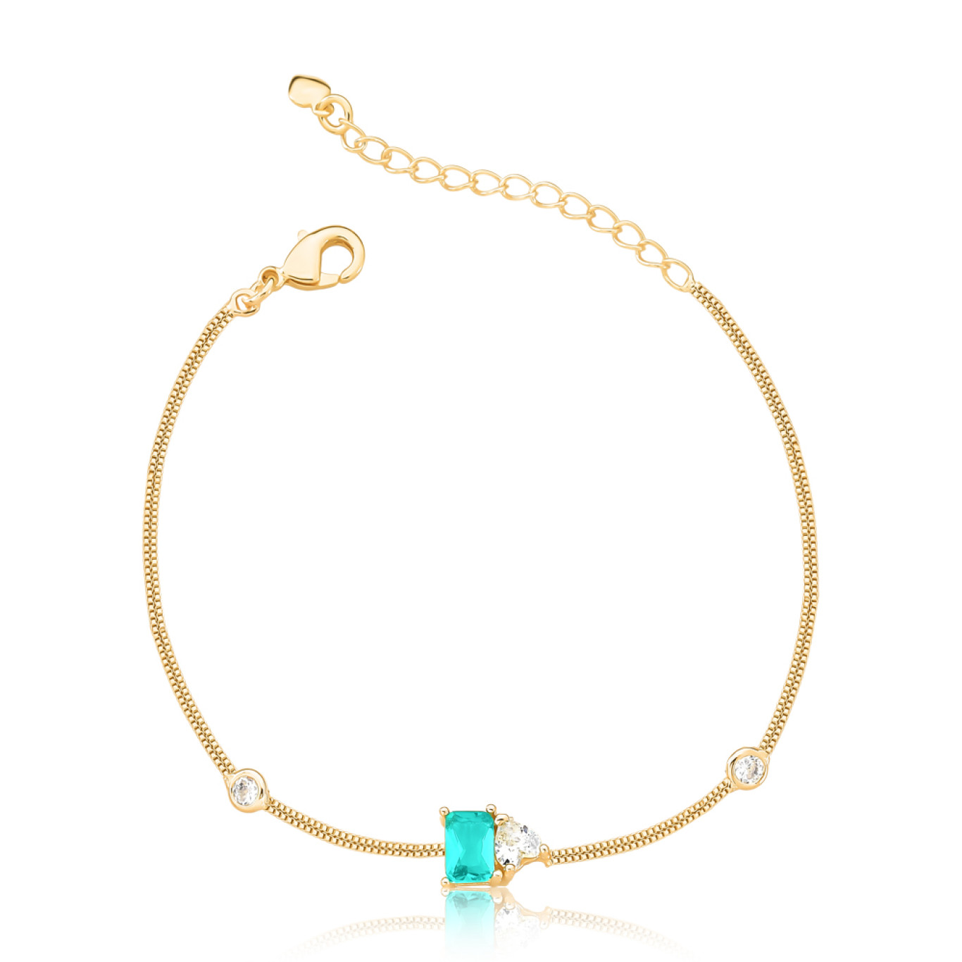 Malha veneziana dupla com duas zircônias centrais fixas, uma no formato retangular na cor turmaliza e uma de coração branco. Detalhes com dois pontos luz de cristais fixos.