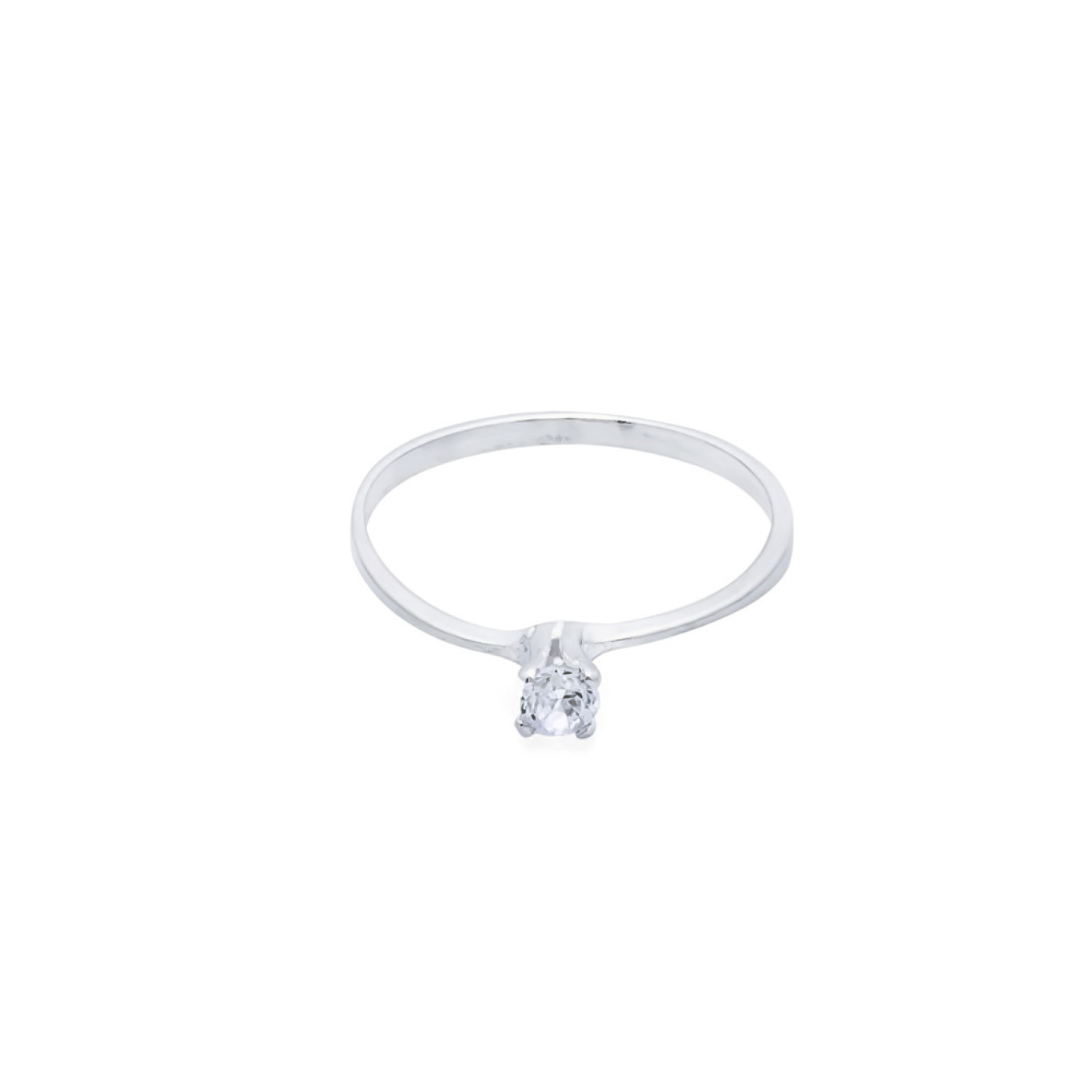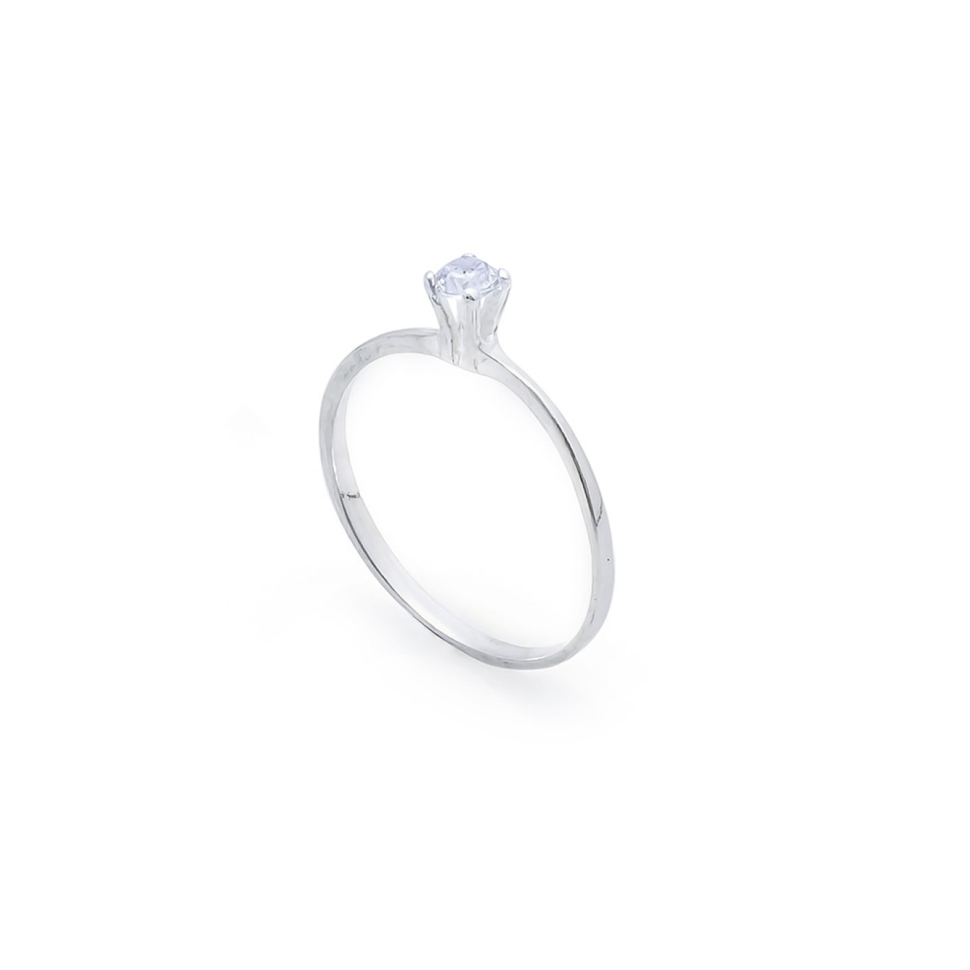 Modelo infantil solitário. Joia delicada com aro fina e zircônia presa por 4 garras.