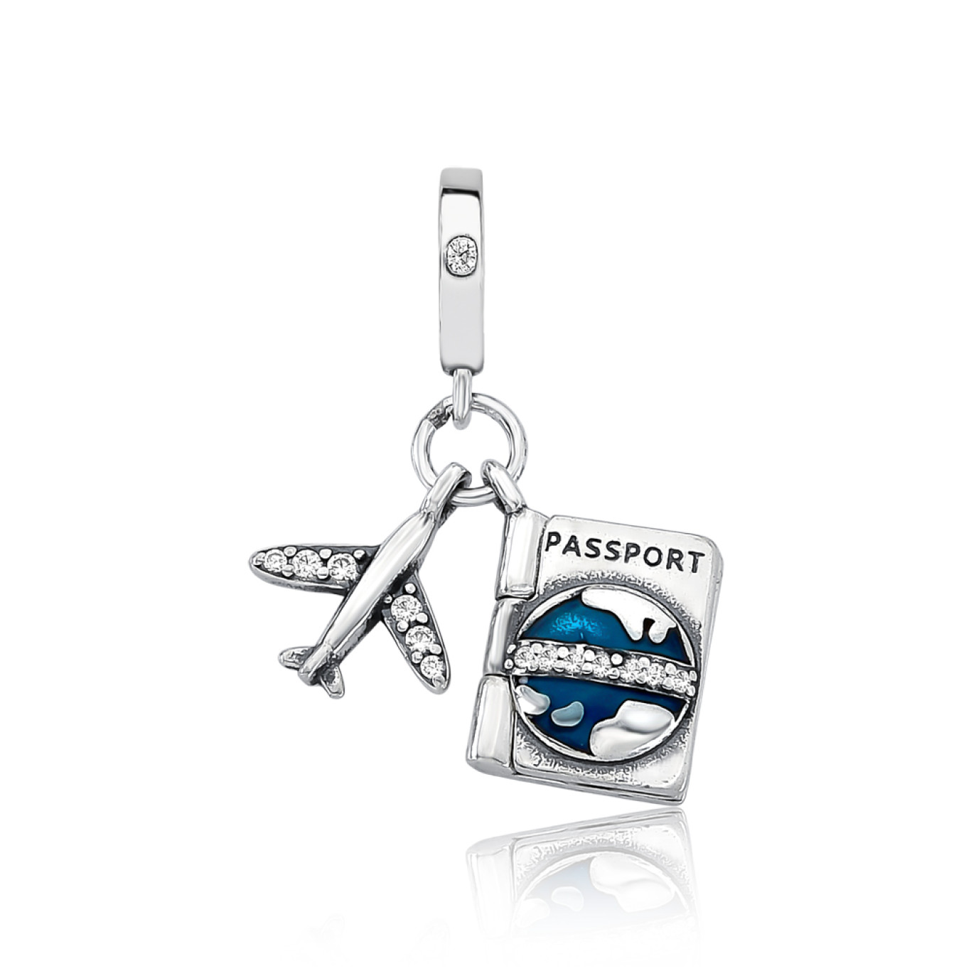 Modelo possui argola e 2 pingentes suspensos de avião e passaporte com detalhes cravejados e resina azul.