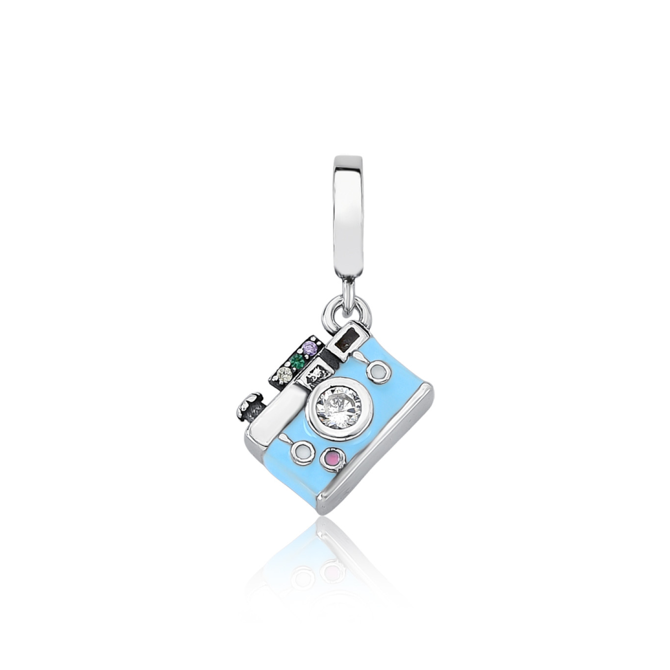 O modelo possui argola superior e pingente de câmera fotográfica suspensa, com detalhes em resina azul e pedras cravejadas que garantem brilho e sofisticação.