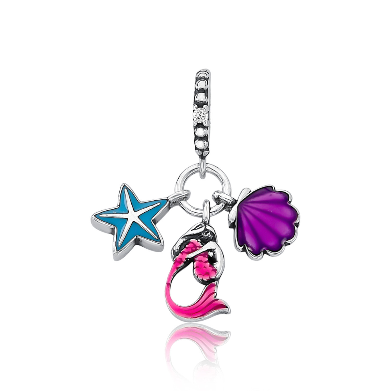 Modelo possui argola e pingentes suspensos de sereia com resina rosa, estrala do mar resina azul, e concha com resina rocha.