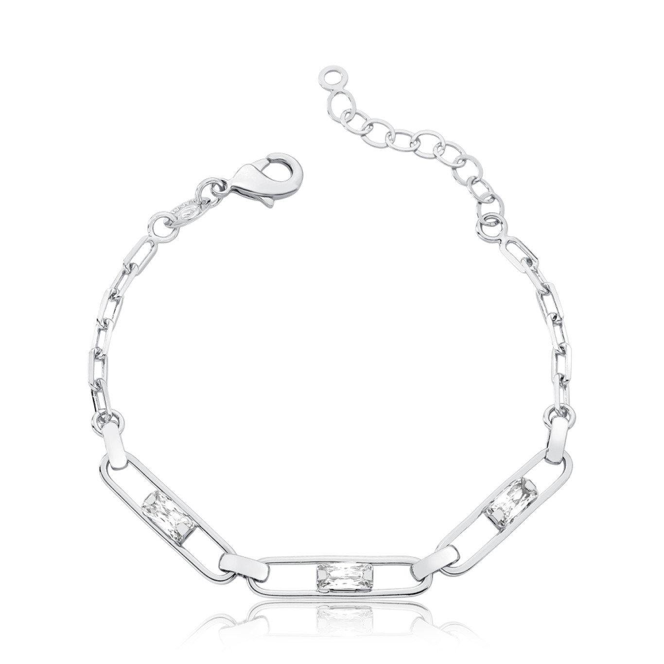 Modelo malha cartier com elos e 3 zircônias retangulares centrais.